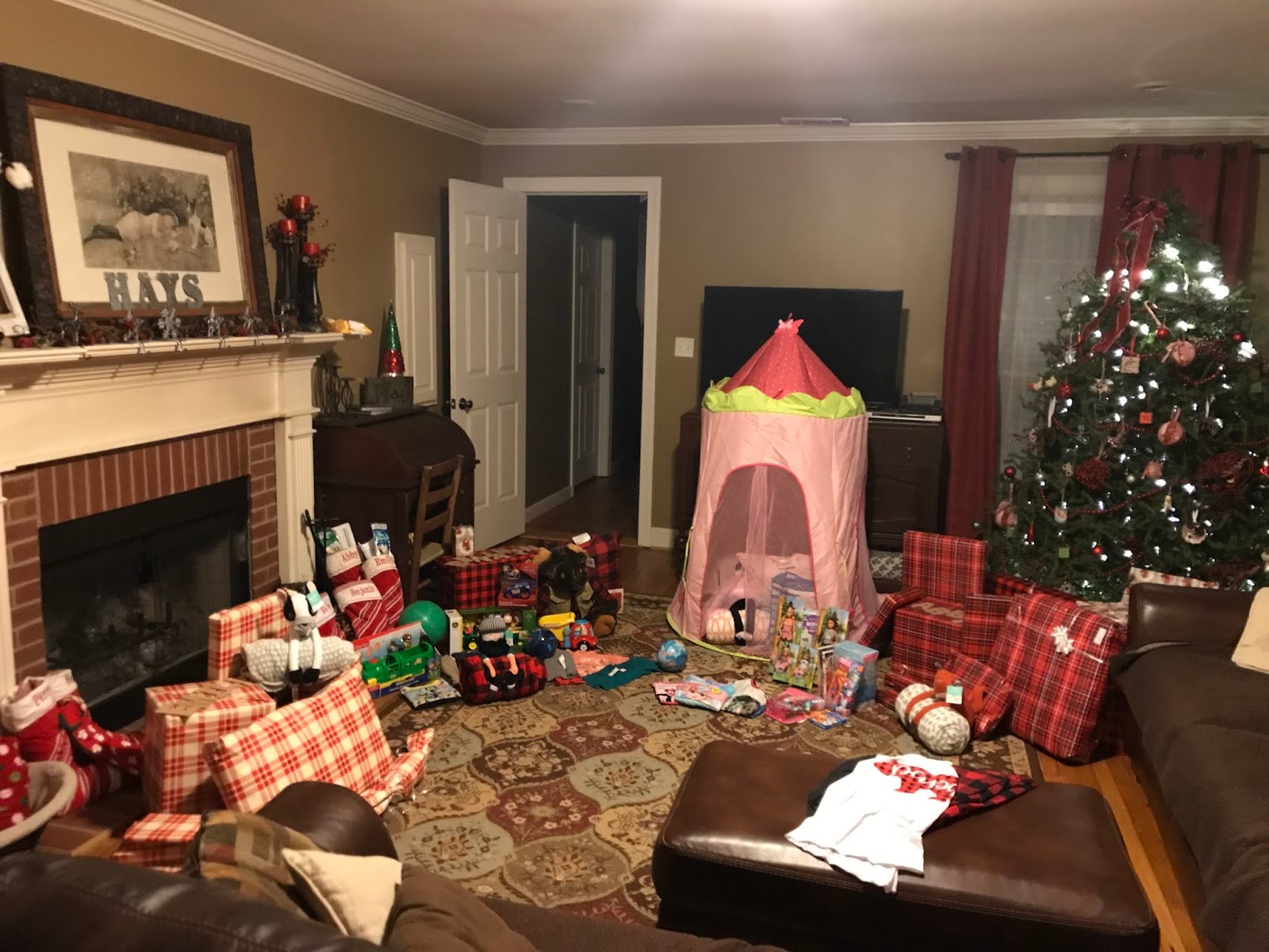 Christmas morning is always a fun, busy morning. This year we woke the big girls up first and let them enjoy opening their gifts in peace. Then one by one we woke up the little people to see their goodies. It takes up a lot of space to do Christmas morning for 4 children!